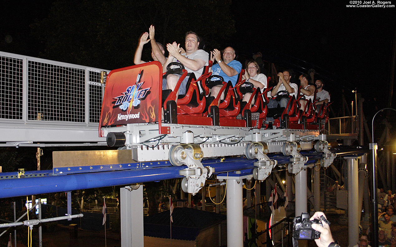 The American Coaster Enthusiasts (ACE) organization spent three days at Kennywood during Coaster Con XXXIII. After several days of around-the-clock activity in order to finish the new ride, Sky Rocket was ready for its first riders at about midnight on June 22, 2010. This was the first trainload of passengers. Even the construction workers putting the finishing touches on the ride photographed it as it returned to the station.