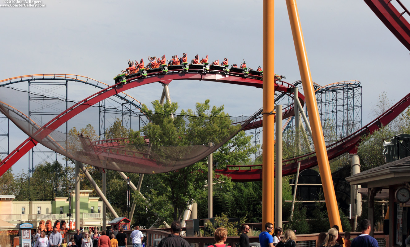 Diamondback has a lot hills, but it also has a 287° counter-clockwise helix before the mid-course brake run and this 323° clockwise helix before the track crosses the Rivertown midway.