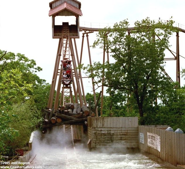 Portions of this ride were removed from the park at the end of the 2003 season. The flume where the cars floated downstream was removed, but much of the coaster track including this drop into the water remained and were used to create Powder Keg. That ride, an S&S air-launched coaster, opened in 2005.