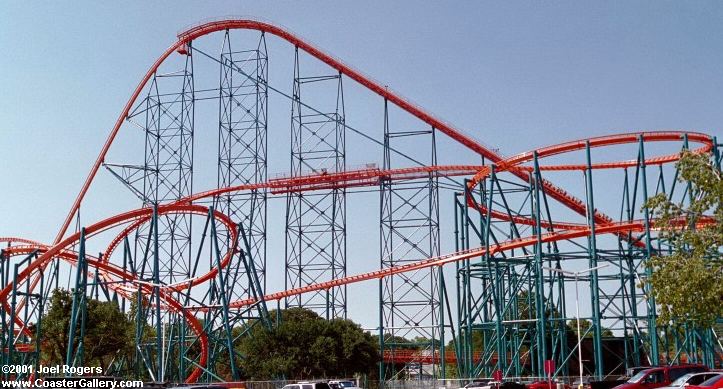 looms over Six Flags Over Texas with this huge 245-foot hill.