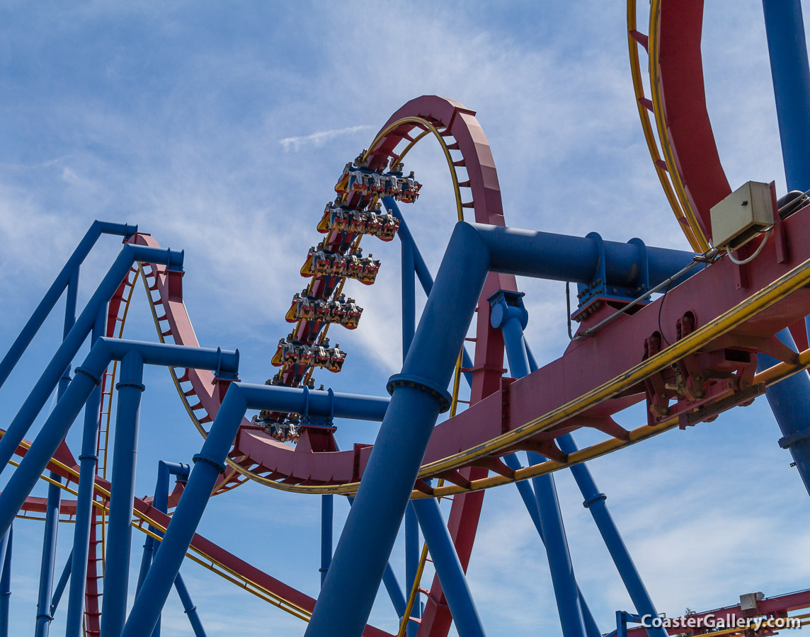 Mounted between the yellow rails on the right side of the picture is the coaster's first trim brake. Situated after the first drop and before the Pretzel Loop, it consists of just a single pair of pads that can squeeze together to slightly slow the train as it whizzes by. The single brake doesn't have enough stopping power to bring the train to a complete stop, but if necessary, it can reduce the train's speed if sensors detect that a train is moving faster than a pre-programmed value.