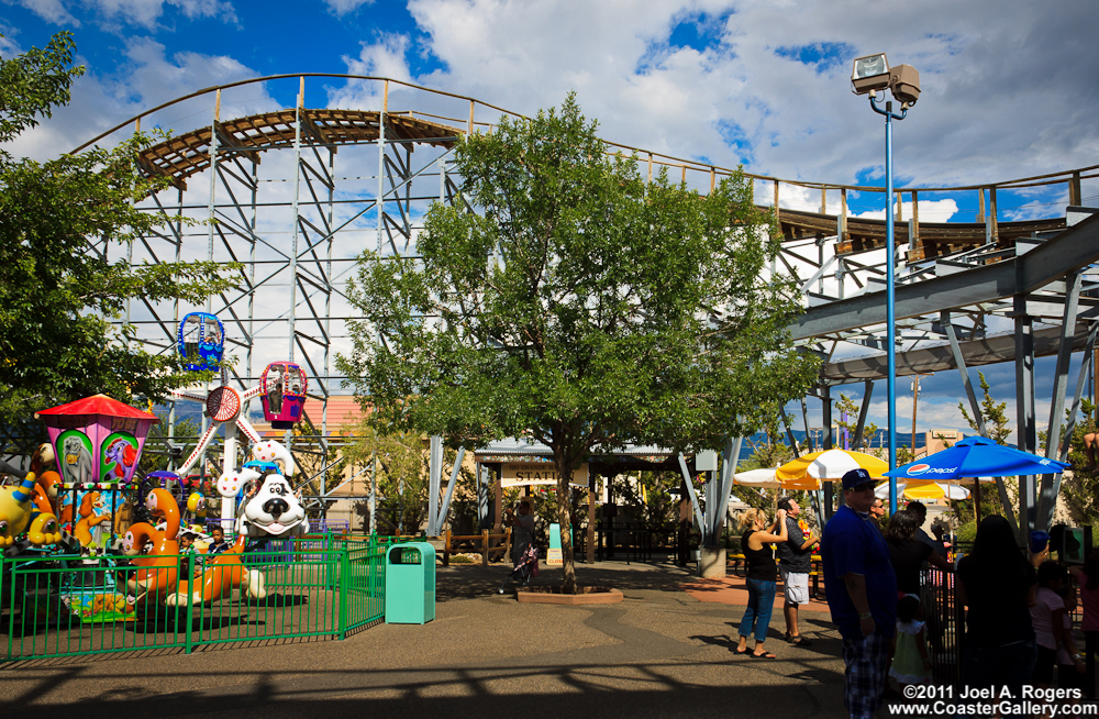 I am always amazed when a small park finds space for a big roller coaster. Cliff's had to build major portions of the New Mexico Rattler above other rides and walkways.