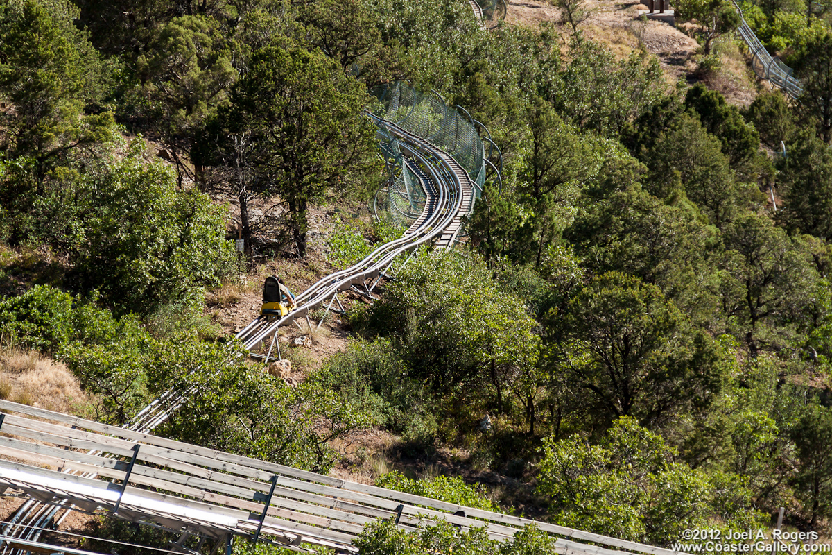 The track only goes downhill, never back up like on most roller coasters... But there are some little hops like the ones this yellow car is approaching.