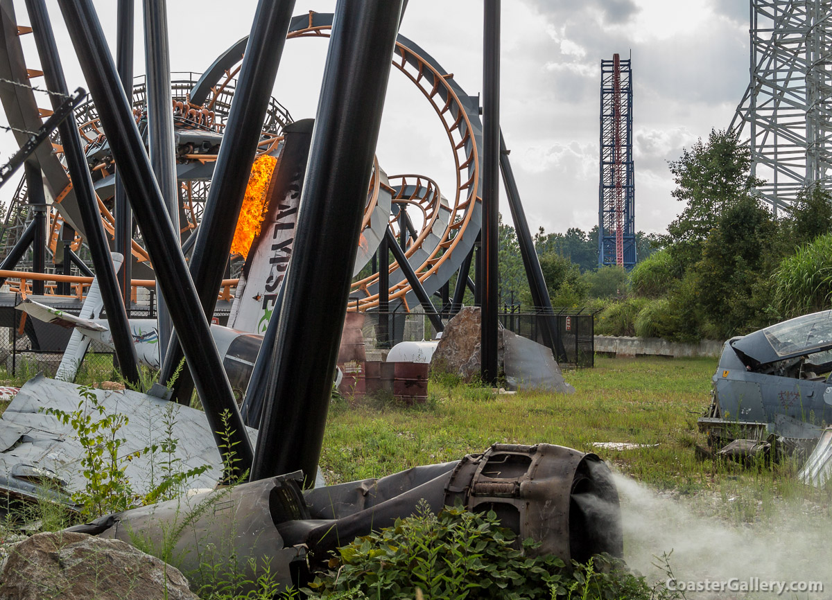 I guess Six Flags was going for an apocalyptic theme because there are crashed airplanes, trash, and a fireball next to the ride.
