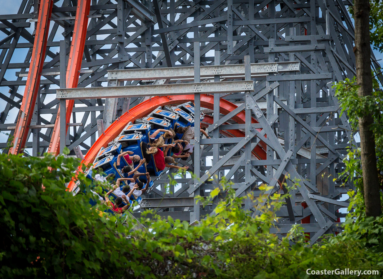 A little of the first drop is visible on the left. Both the second and third inversions cut into the first hill's support structure. While I know that there is adequate clearance, it sure looks like you can reach up and hit some of the many wood and steel support beams during these rolls!